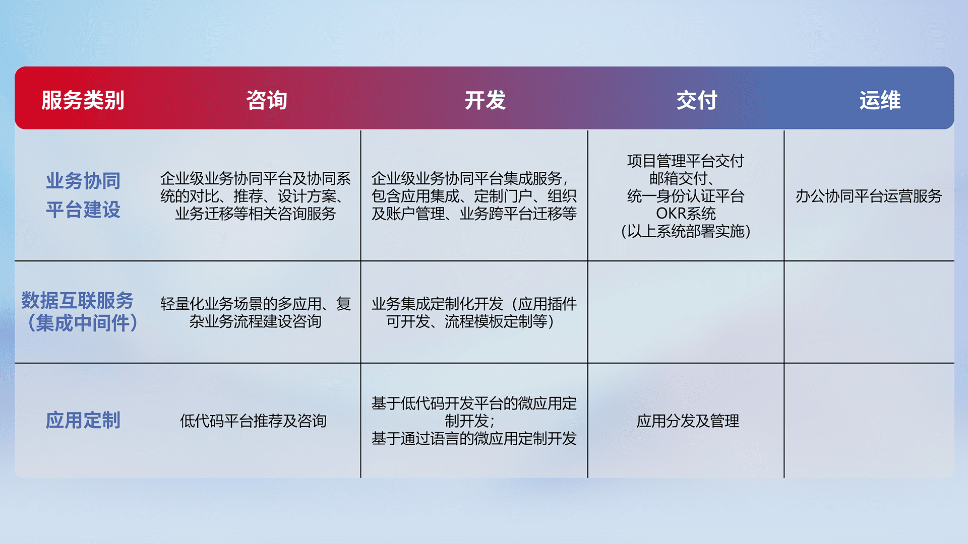 针对钉钉、、、企微、、、、IDaas等平台级产品提供产品的规划、、、、方案、、、交付、、、、定制化开发等服务,,,,实现如统一协同办公、、、、智能客户服务、、混合会议管理、、、、智能数据查询、、等业务场景,,,实现数字化转型。。。。
